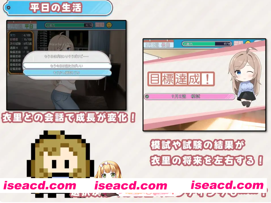 根据指令选择,学力、好感度、情色度等状态会成长,并影响故事的发展。